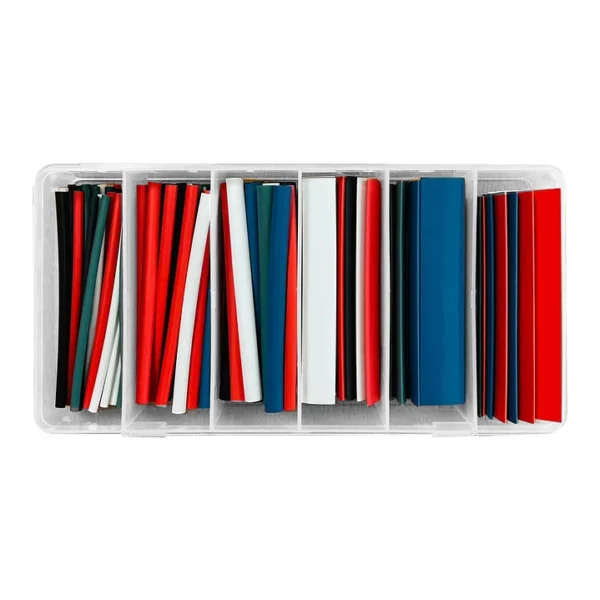 Diámetros antes de contraer (selección típica del kit): 2.4 mm, 3.2 mm, 4.8 mm, 6.4 mm, 9.5 mm, 12.7 mm, 19.1 mm